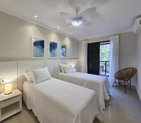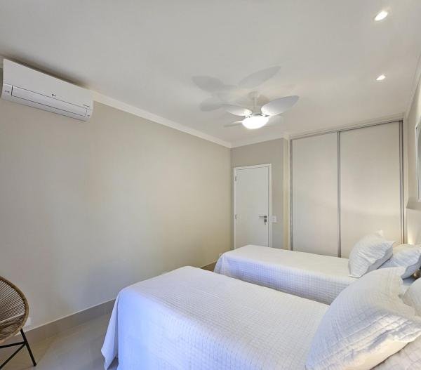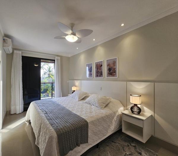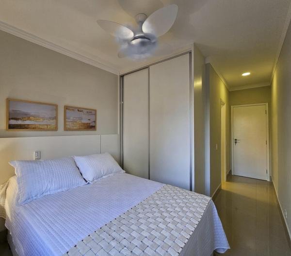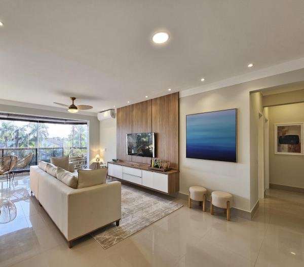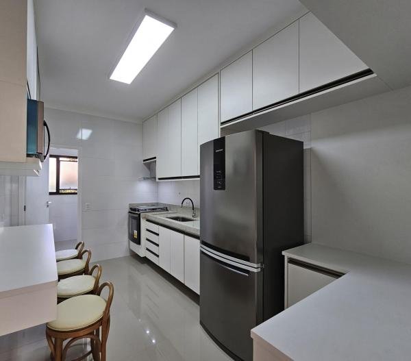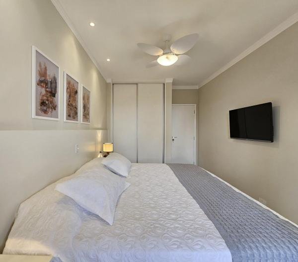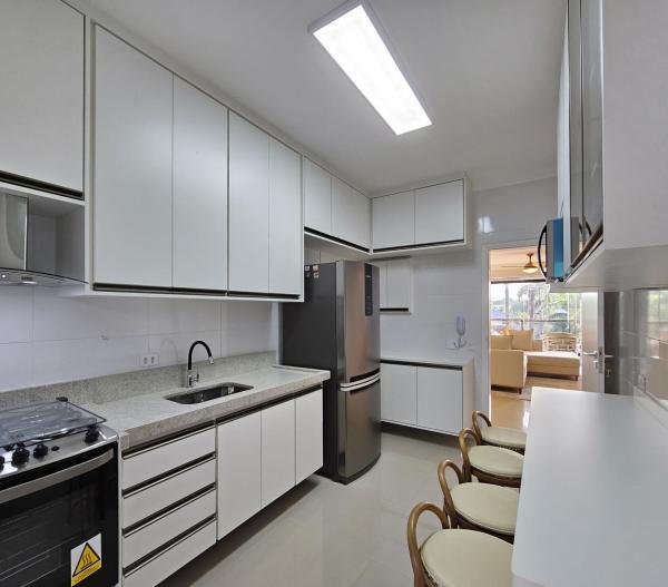 Deslumbrante apartamento Pé na areia, finamente mobiliado e decorado, contendo 3 dormitórios, sendo 2 suítes, com armários embutidos e ar-condicionado, living para 2 ambientes com ar-condicionado e fechamento de vidro na sacada, 1 WC social, cozinha tradicional, com armários, completa, porta de entrada com fechadura eletrônica, área de serviço e 2 vagas de garagem cobertas. Área útil de 132,02 m2 e sua área de lazer conta com quadra poliesportiva, sauna, 3 churrasqueiras e forno de pizza, piscina aquecida e salão de jogos.