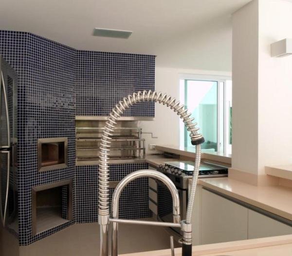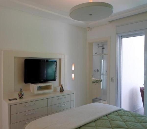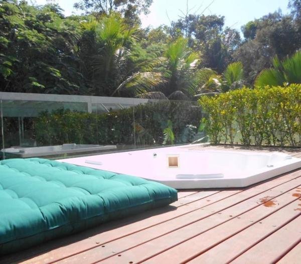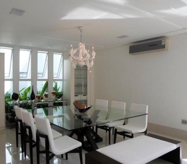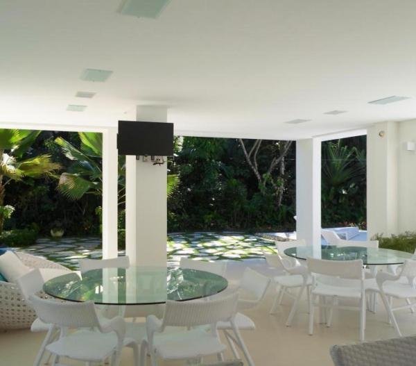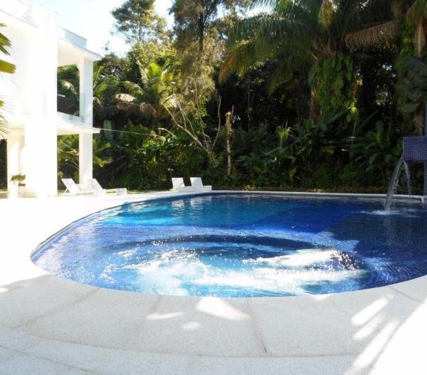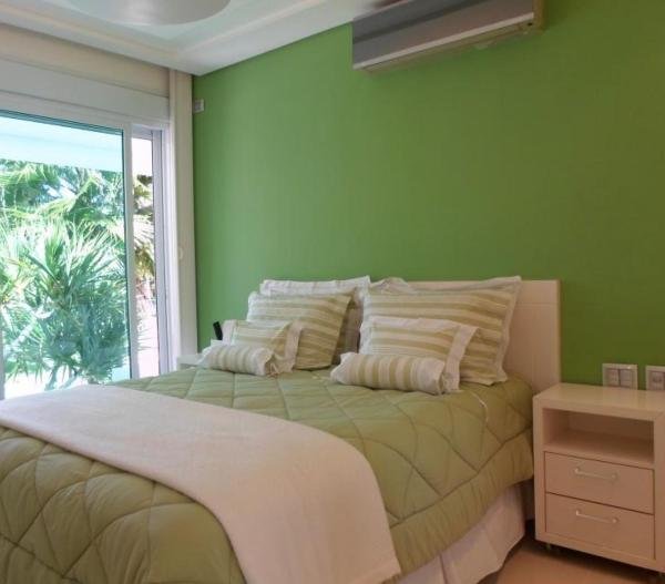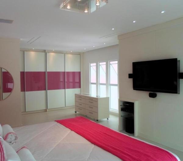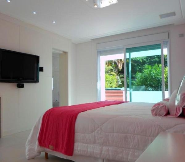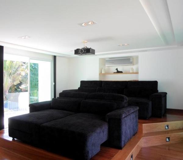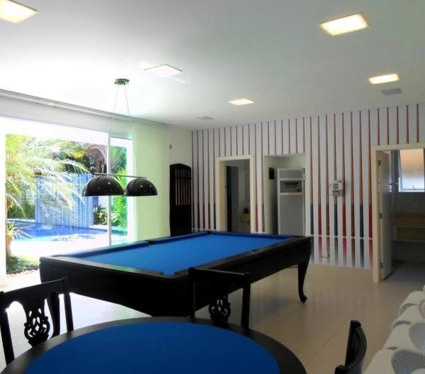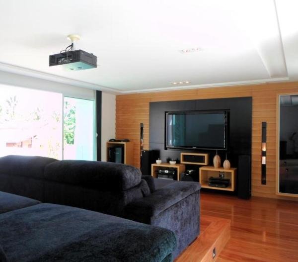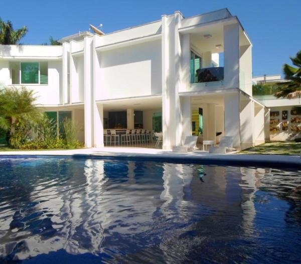 Casa de alto padrão, num terreno de 1.191,40 m2. São dois pavimentos, sendo 6 suítes (2 delas master com hidro), todas com armários embutidos de primeira linha, ar-condicionado, terraço, living p/ 3 ambientes com decoração esmerada, lavabo, cozinha tradicional com armários completa, depósito, área de serviço, dormitório e wc de empregada, linda varanda gourmet com churrasqueira e forno a lenha, próxima a piscina e com vista para área verde, 6 vagas de garagem, área útil de 943,70 m2. Equipagem: piscina, sauna úmida (contendo wc masculino e feminino) ducha, parabólica, sala de jogos, sala de cinema com home theater, jacuzzi, sensor de alarme infravermelho, piscina aquecida.