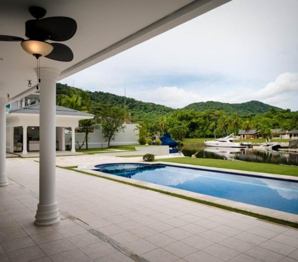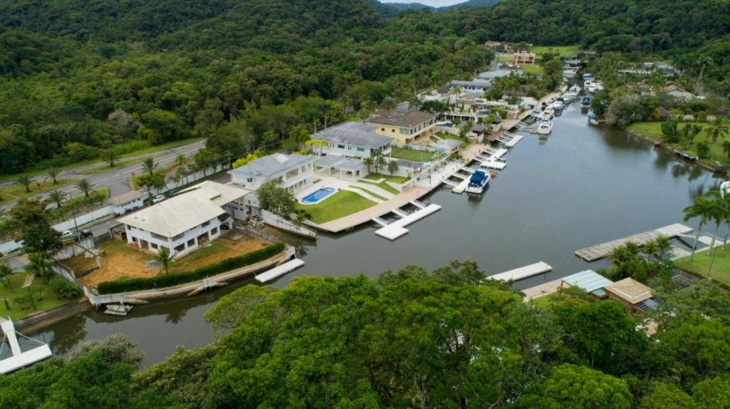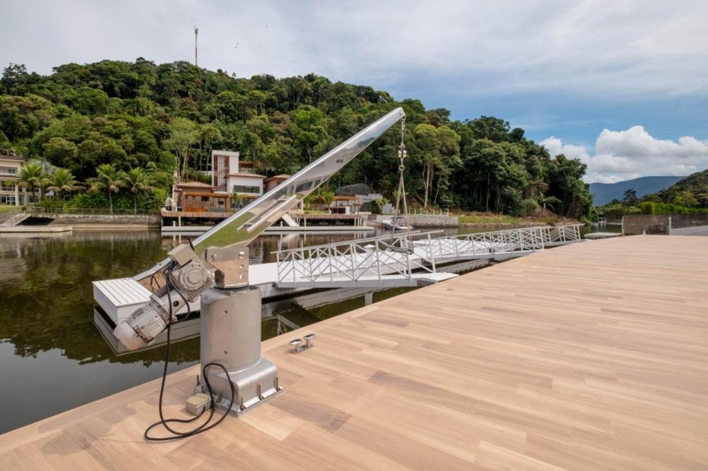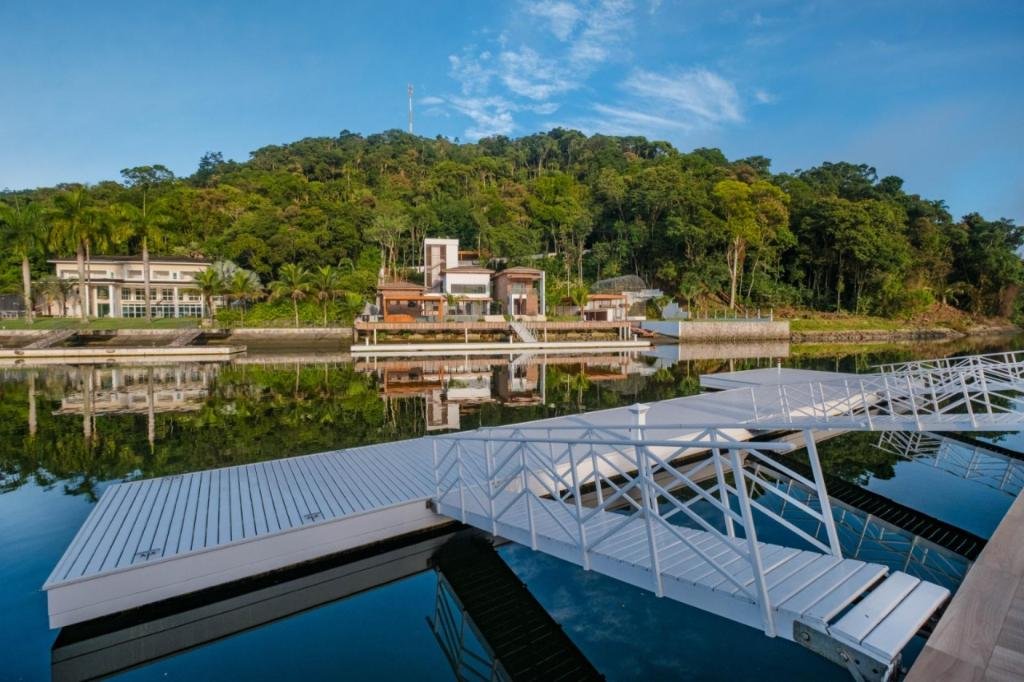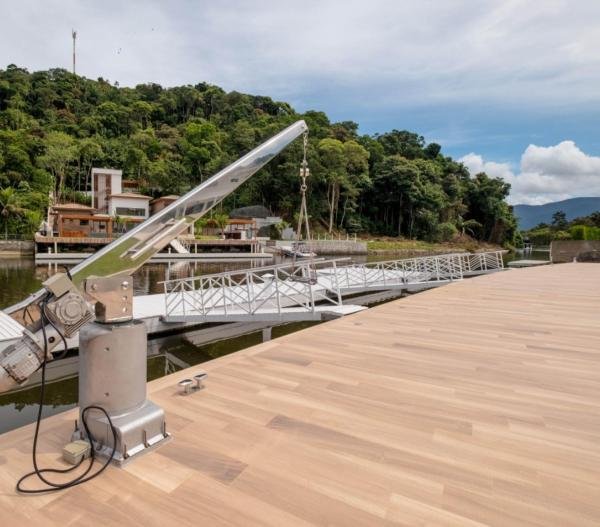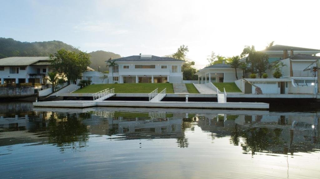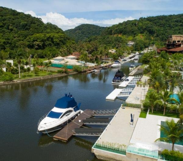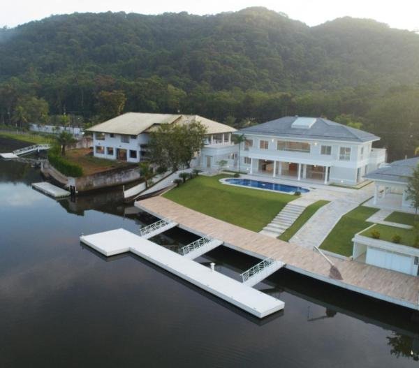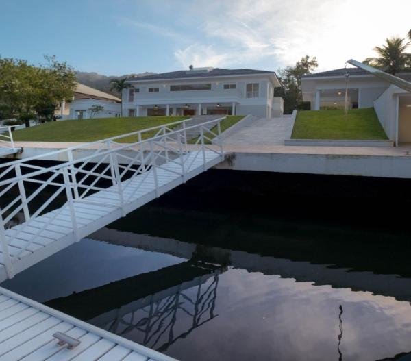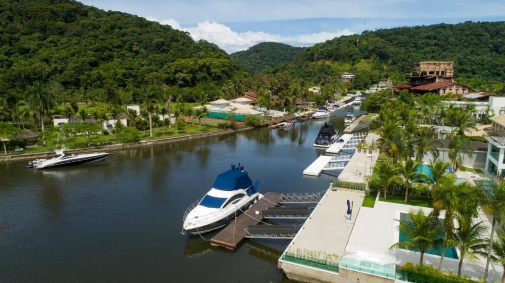 Excelente casa para lazer náutico com ótima estrutura no condomínio Marina Guarujá. A propriedade foi construída em um terreno de 1.850 m² e dispõe de belas suítes, varandas voltadas ao canal, living para vários ambientes. Pé direito duplo, cozinha americana, ambientes com ar-condicionado e central de água quente para toda a casa. Destaque para a rampa para barco de até 28 pés, com guincho de 10 toneladas para colocação e retirada da água e garagem náutica para jets sky, com torre motorizada para colocação e retirada de até 450 quilos. A área de lazer é composta por piscina, salão de festas com banheiro, sauna úmida e quintal. Detalhes do imóvel: Área construída: 750,00 m² + 250,00 m² - Deck e arruamento para acesso da rua até o deck e garagem náutica, totalizando 1.000,00 m². São 4 suítes, sendo uma master, com hidromassagem e armários embutidos + suíte para motorista, segurança ou babá + home theater com banheiro completo, podendo ser reversível como suíte para idosos opcionalmente. Condomínio com infraestrutura completa, segurança, portaria social, portaria náutica e zeladoria. Deseja saber mais informações, entre em contato conosco!
