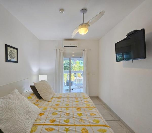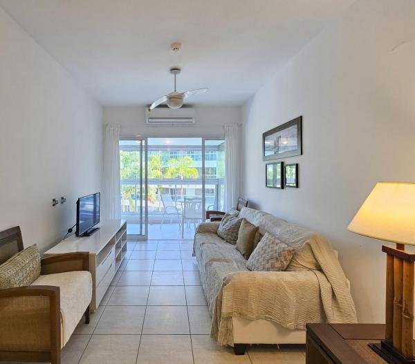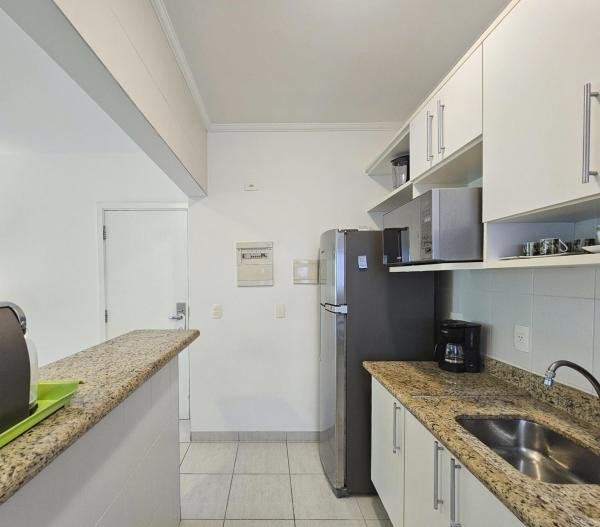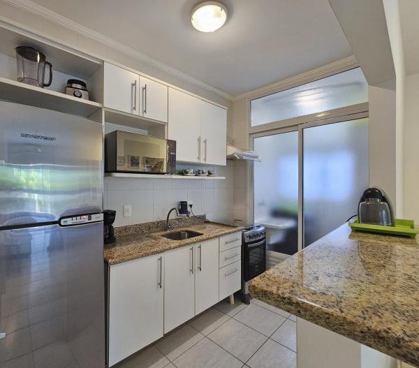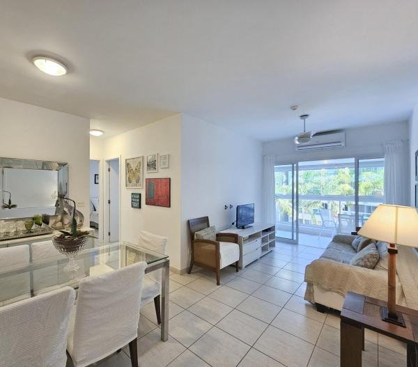 Excelente apartamento, com vista parcial para o mar. São 2 dormitórios, sendo 1 suíte, todos com armários embutidos, terraço, living para 2 ambientes, integrada com a cozinha toda equipada, ar-condicionado em todos ambientes, área de serviço, muito bem mobiliado, 2 vagas de garagem cobertas, PE compartilhada.São 80,00 m2 de área útil e serão retirados os objetos pessoais.