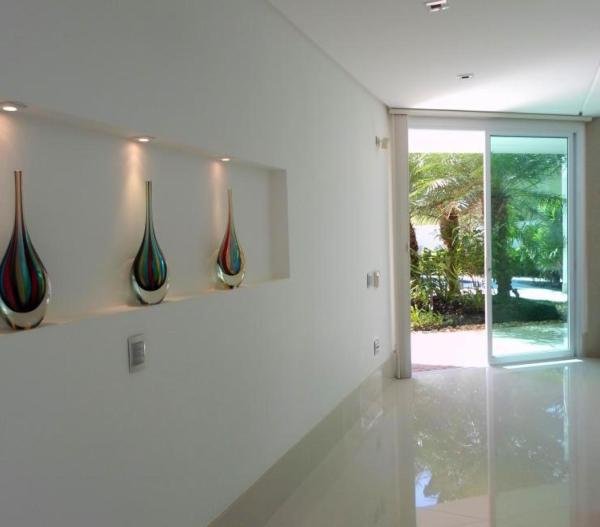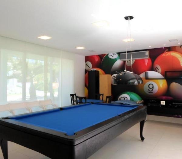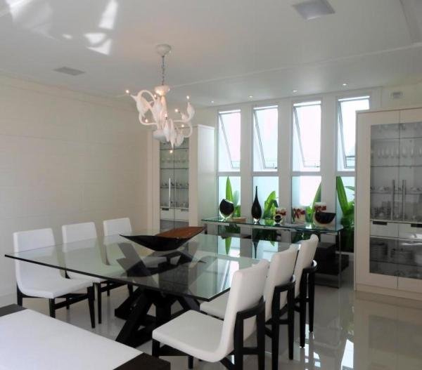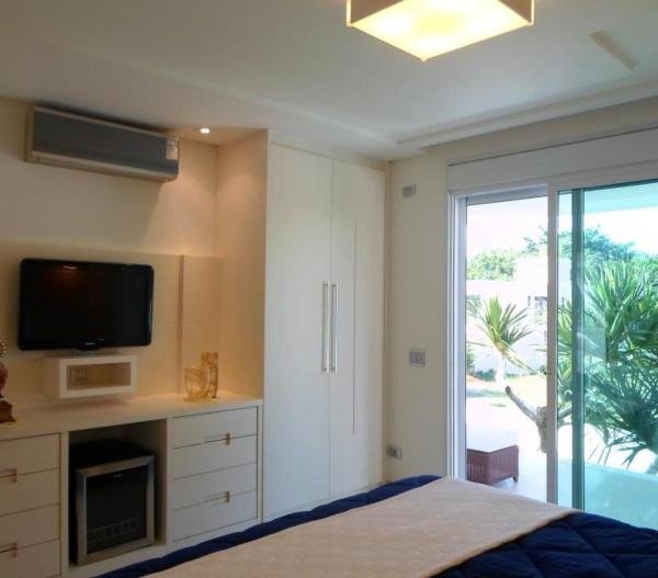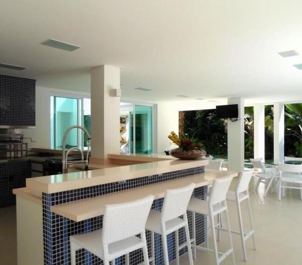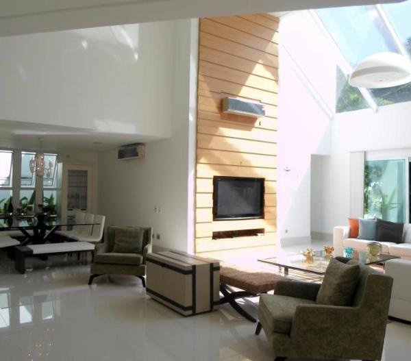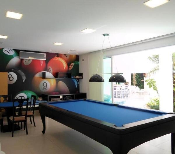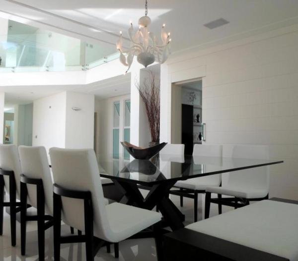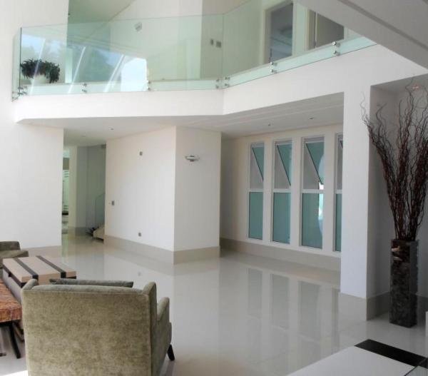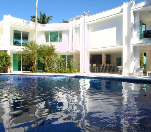 Casa de alto padrão, num terreno de 1.191,40 m2. São dois pavimentos, sendo 6 suítes (2 delas master com hidro), todas com armários embutidos de primeira linha, ar-condicionado, terraço, living p/ 3 ambientes com decoração esmerada, lavabo, cozinha tradicional com armários completa, depósito, área de serviço, dormitório e wc de empregada, linda varanda gourmet com churrasqueira e forno a lenha, próxima a piscina e com vista para área verde, 6 vagas de garagem, área útil de 943,70 m2. Equipagem: piscina, sauna úmida (contendo wc masculino e feminino) ducha, parabólica, sala de jogos, sala de cinema com home theater, jacuzzi, sensor de alarme infravermelho, piscina aquecida.