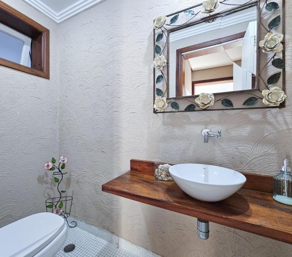 Belíssima casa assobradada, bem arejada, localizada em rua larga, contendo 4 suítes amplas, sendo uma no térreo, com ar-condicionado, living para 2 ambientes, lareira, sala de TV, lavabo, 4 vagas de garagem, cozinha americana, edícula, depósito, área de serviço, piscina com cascata, área gourmet com churrasqueira e forno a lenha. Sua área construída é de 339,20 m2 em um terreno grande de 576,67 m2.